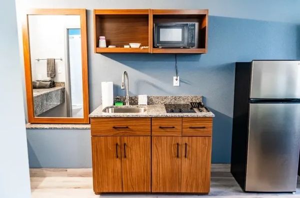 King and Double Queen rooms meet your needs with a kitchenette featuring a cooktop and microwave along with a spacious bathroom and combined living area.